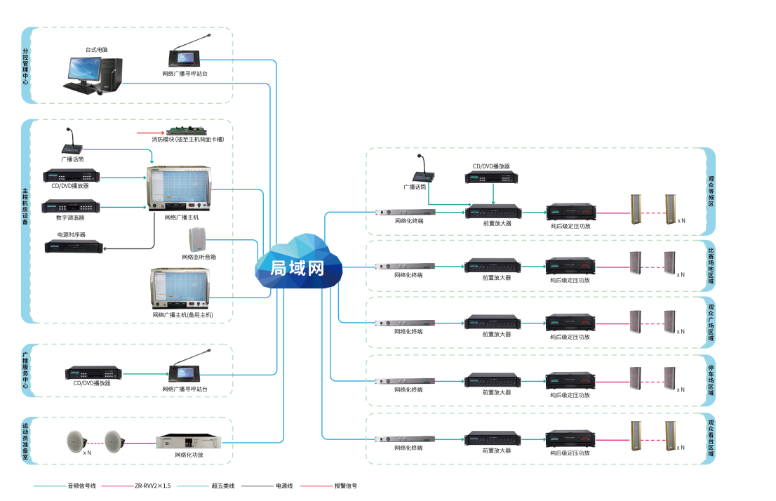 系统可利用现有的局域网架构,给广播系统划分一段VLAN,指定终端!P地址,即可实现计算机网络、数字视频监控、公共广播等网络的多网合一,施工简单快捷